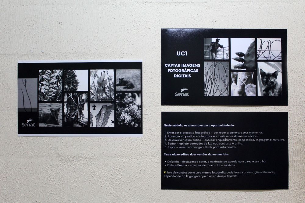 Durante essa etapa, os adolescentes tiveram a oportunidade de conhecer a câmera e seus elementos; fotografar e experimentar diferentes olhares; analisar enquadramento, composição, linguagem e narrativa; aplicar correções de luz, cor, contraste e brilho; e, ainda, selecionar imagens finais para a mostra.