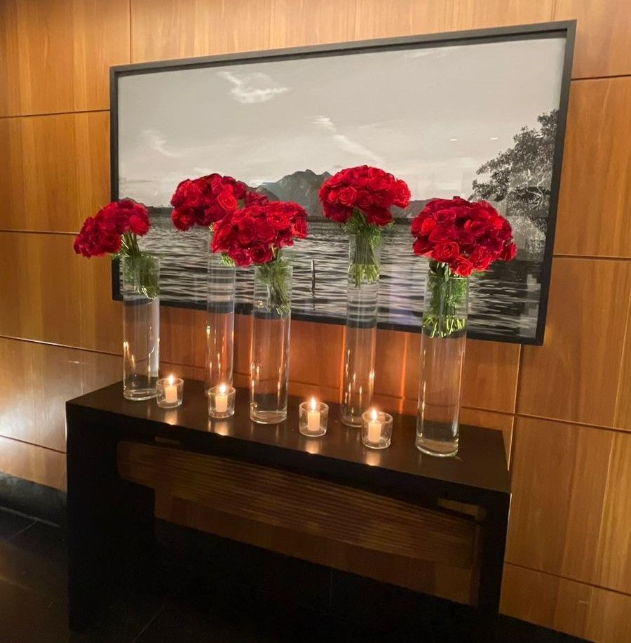 Os casais foram recepcionados com música ao vivo, que incluiu performances de piano, violino, saxofone e harpa, criando um clima envolvente e apropriado para a data. Já a decoração das mesas foram compostas por flores e luz de velas, que acrescentaram um toque de romantismo à noite.