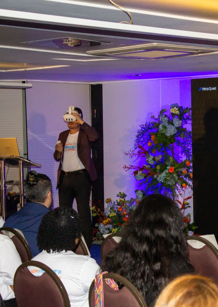 O professor e especialista em tecnologia, Romero Tori abriu o encontro com uma palestra que analisou os preconceitos em relação ao EAD, discutiu as metodologias aplicadas nas modalidades de ensino utilizadas atualmente, e ainda permitiu ao público experienciar uma imersão no espaço 3D, através do Meta Quest, que simula um ambiente virtual.